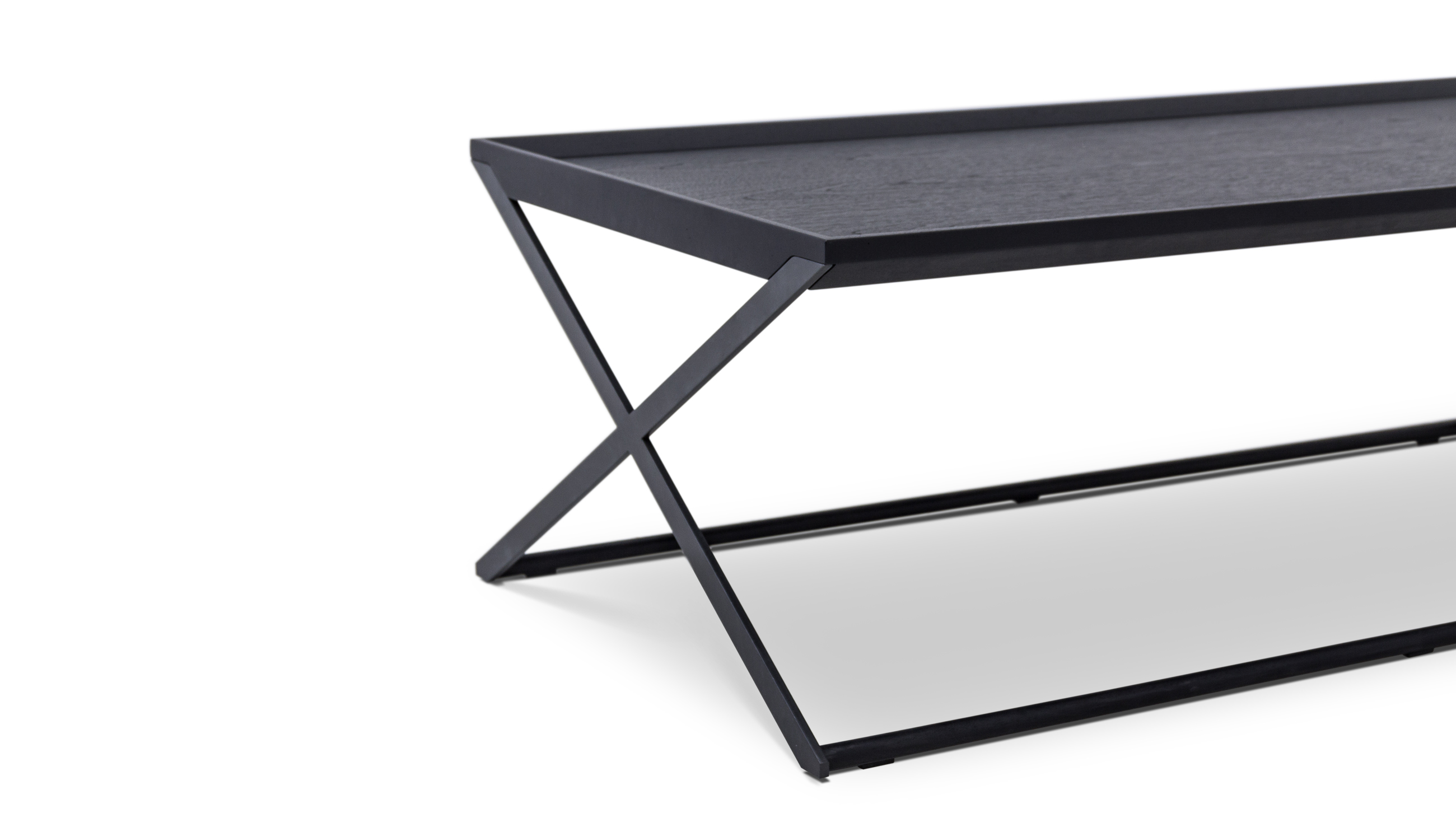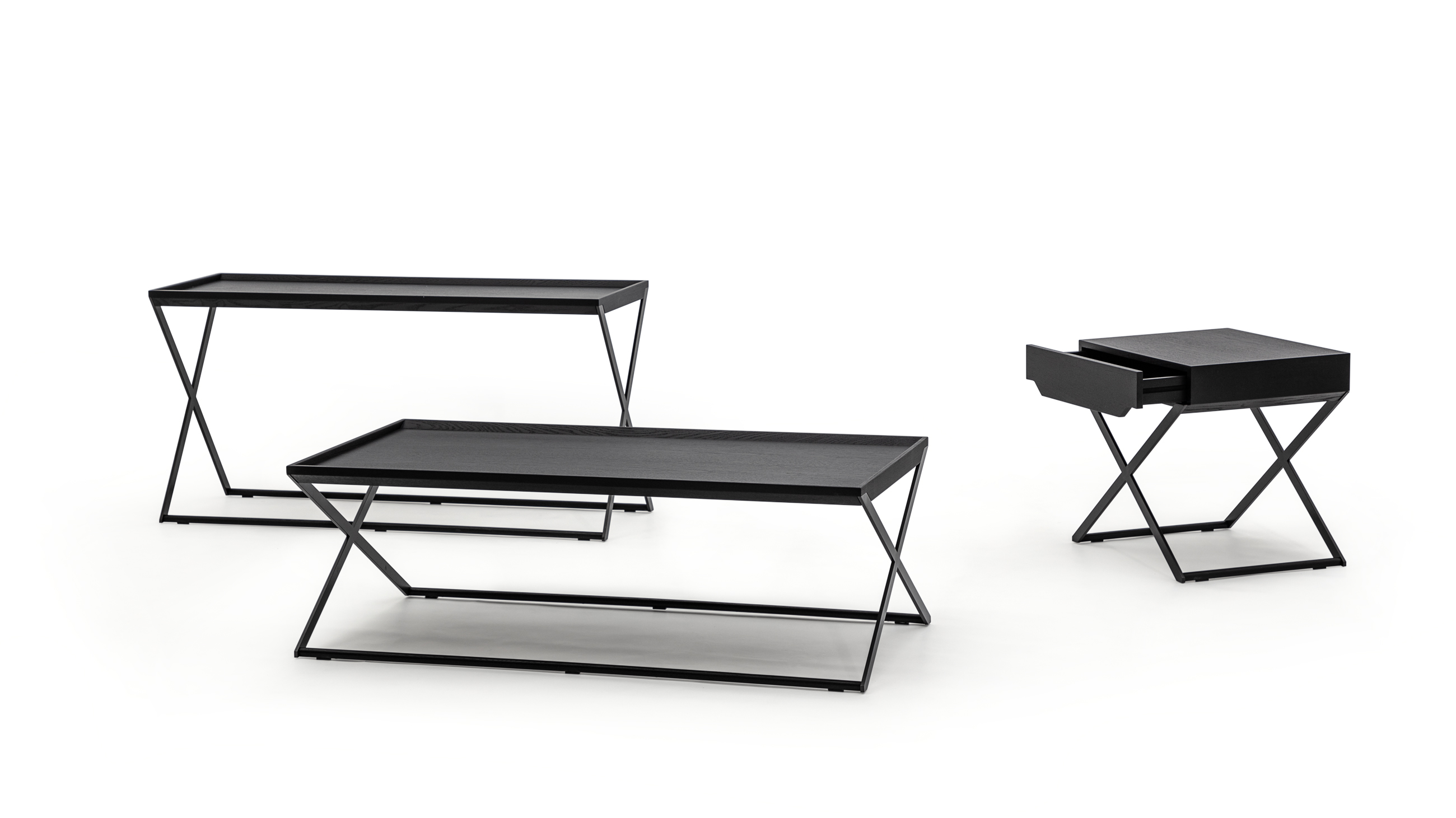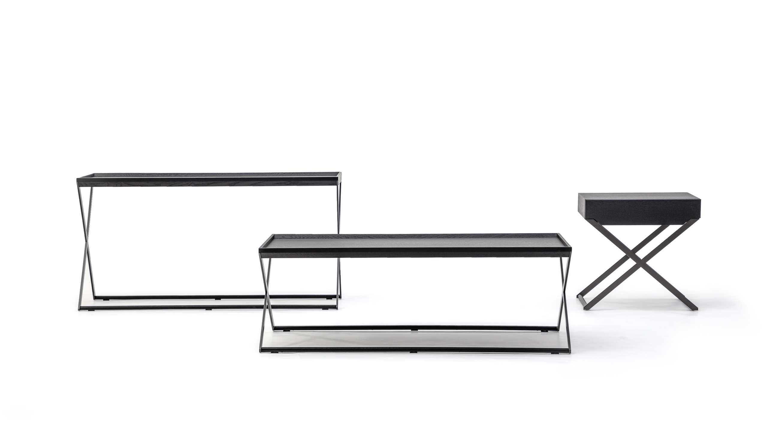 这一系列产品是设计师向简约混搭风格的致敬。托盘式桌面边缘设计,呼应交叉的扁钢腿型,减少了视觉厚重感,具有小巧和多用途的特点。可用做乐投平台、边几、床头柜和沙发背桌。