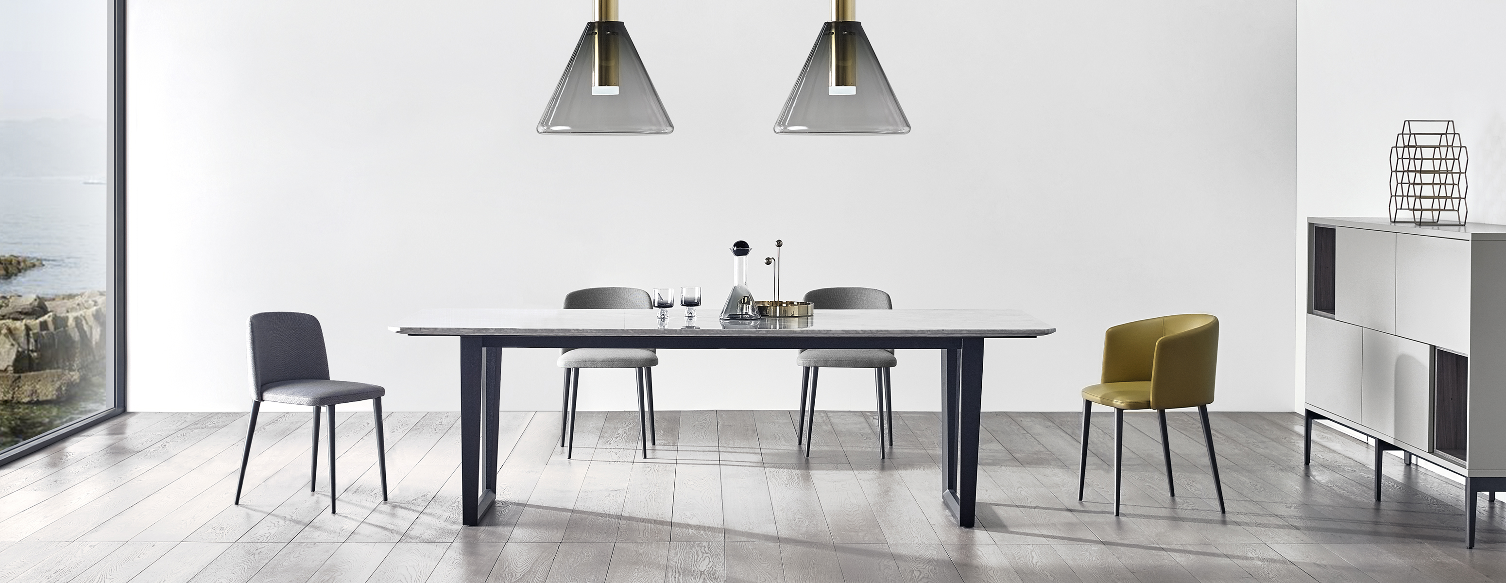 桌面、桌腿、抽屉等不同方向和角度的切面,为产品赋予了未来感,可用作餐桌或书桌。